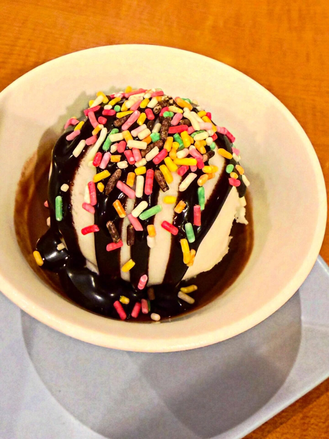 チョコレートのブランマンジェの上に完熟バナナジェラートを乗せ、チョコレートソースとカラースプレーをトッピングしました。