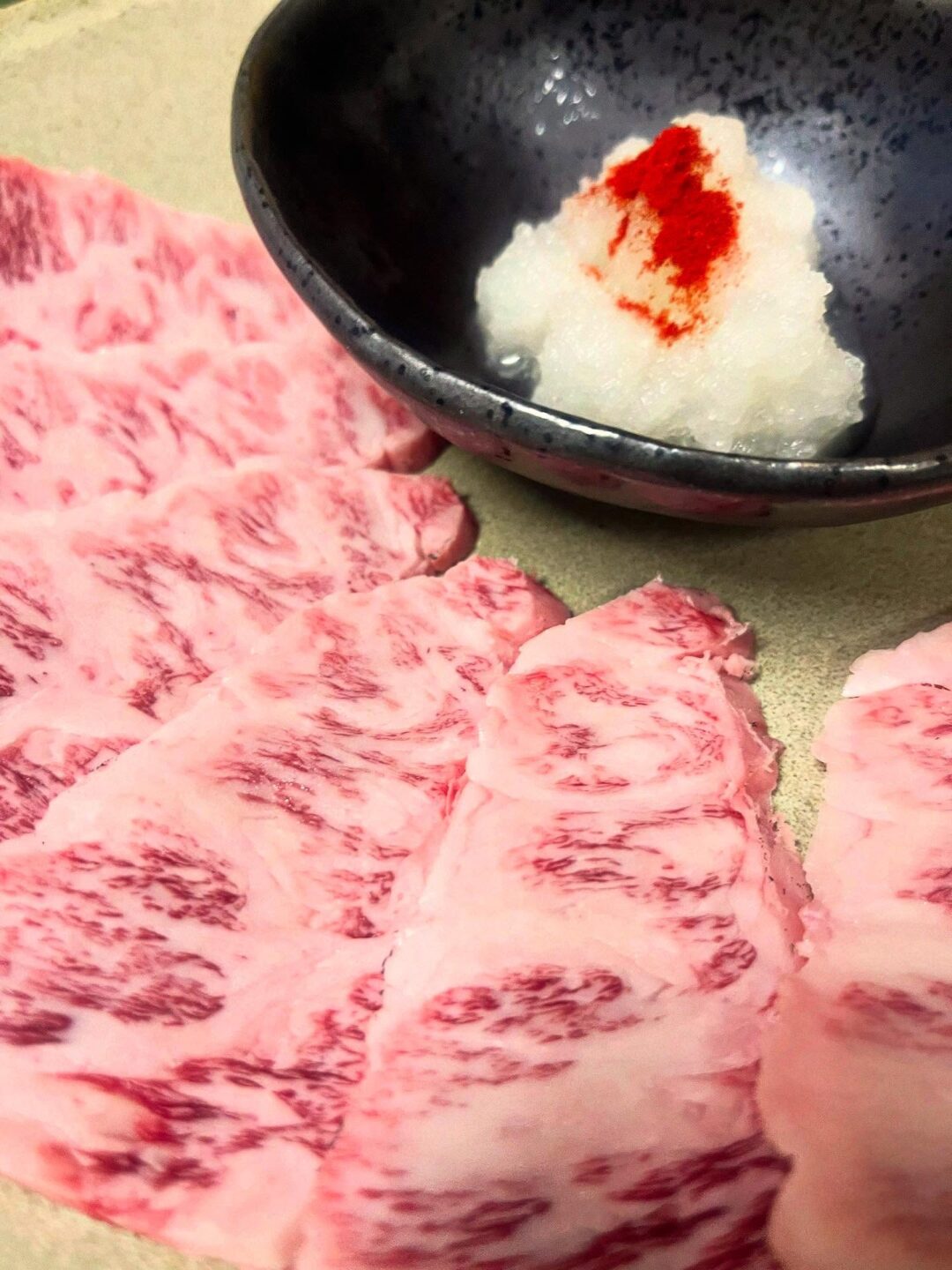 和牛のあばらの部位を使いますが、この部位は肉の味の濃さ、脂の甘さが最高です!しかし、ちょっと脂が多い部位でもあります。なのでおろしポン酢でさっぱりと食べていただくともう最高です!